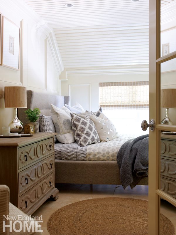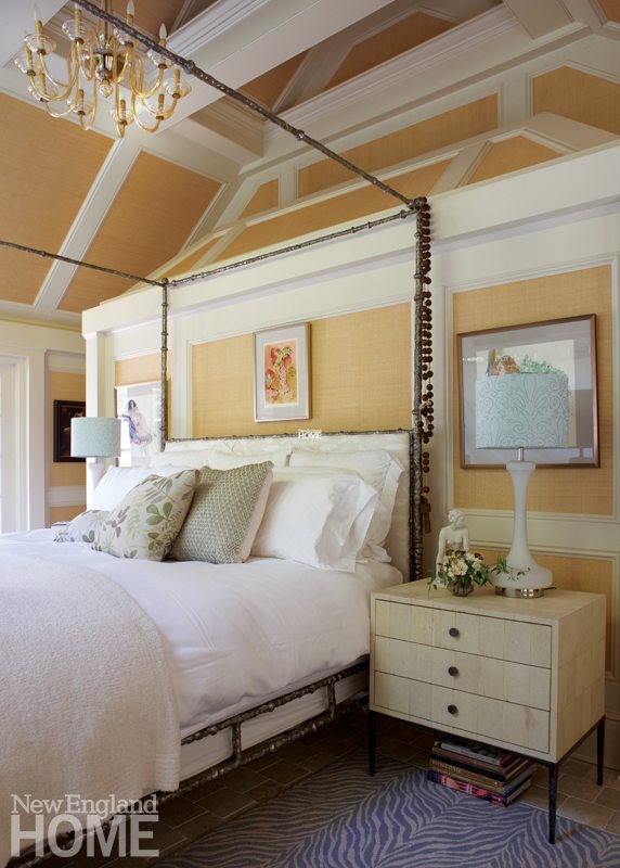 As far as heavenly havens go, however, James’s bedroom wins hands down. Sheathed in a Phillip Jeffries hemp wallcovering described by Quinn as the color of “warm wheat,” the room is a luxurious cocoon. There’s not a whiff of the slightly masculine tone that Quinn remembers permeating the barn. How could there be, with a Murano glass chandelier and a feminine Oly silver-gilt canopy bed? Even the Dorothy Draper benches in the marble master bath are as dainty as can be.