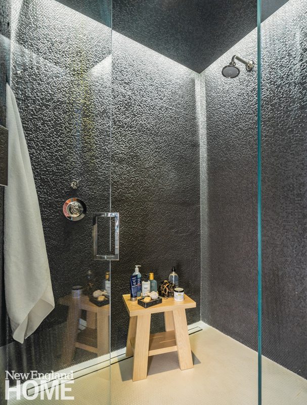 No less eye-catching is a fireplace, mantel, and shelves clad in unfinished, hot-rolled steel, an arresting example of the owners’ love of “materiality”—-letting each element of the design stand on its own without adornment. Built by Woodmeister on Slater’s specifications, the structured boxes of the mantel are “a really amazing combination of textures, volume, height, and depth,” says Wilson. “I conceived it as a 3-D composition,” Slater explains. “It’s functional art.”