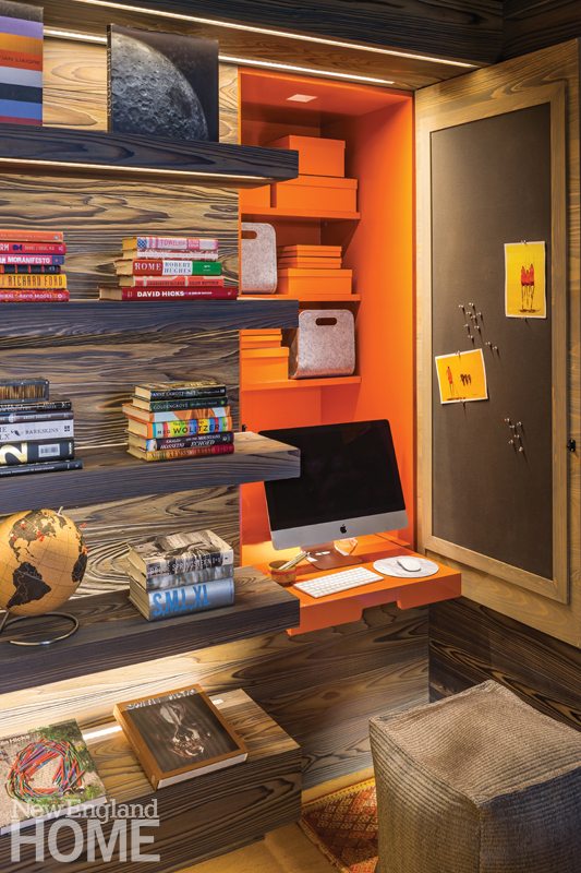 Behind a discreet door in the corner of the room is a small work station with a desk and shelves painted in bright orange gloss—a rare burst of color and sheen in the owner’s favorite hue, which is also found in pillows, a stair runner, and a few other accents throughout the home. “It’s meant to be its own little moment,” says Wilson of the workspace. Taken in harmony with the use of natural wood and glass in the study, it reflects a design ethos that’s “definitely modern, but with soft edges,” he explains.