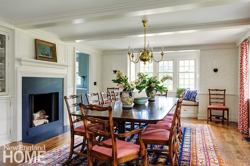 The vision was to create a five-bedroom farmhouse-inspired residence “that looks like it has evolved over a couple of centuries,” explains MacNeille, who ultimately removed portions of the existing structure to realize a final product that is more than double in size. “It has a traditional New England vernacular, with a red-cedar shingle roof and copper detailing.” Inside, each of the main spaces features a fireplace—which is typical of older homes in the region—while rustic oak flooring, beams, and paneling lend a timeworn feel.