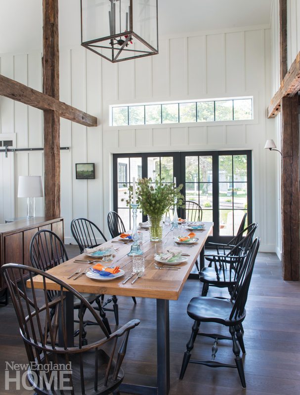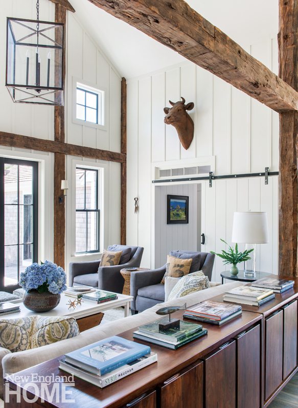 Original barn proportions were used for reference, and authentic interior flourishes include board-and-batten wall treatments, sliding barn doors to the pantry and master suite, and, hung on a wall, an antique rake that hails from a barn on the farm where Bagshaw grew up outside of Exeter, New Hampshire. “As a kid I spent as much time building forts in the barn as in the house, so this was a lifelong vision I had,” he says.
