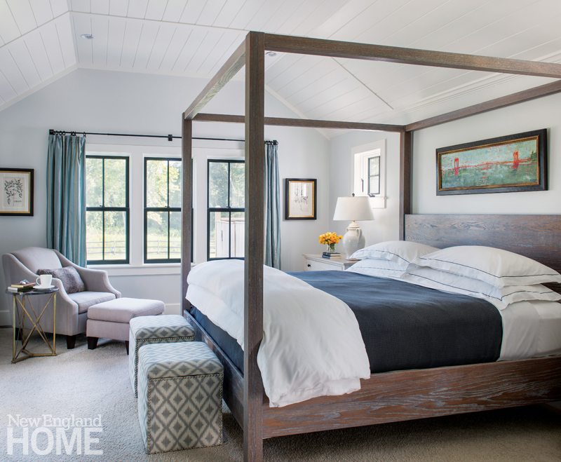The master suite sits at the very back corner of the barn, as far away from the road noise of 6A as possible, and includes a bath that features a soaking tub, walk-in closets, and separate vanities for the two men. “There’s lots of space, so we can have a lot of people here and still find a place to hide away,” says Lancaster, who, like Bagshaw, grew up on a New England farm.
