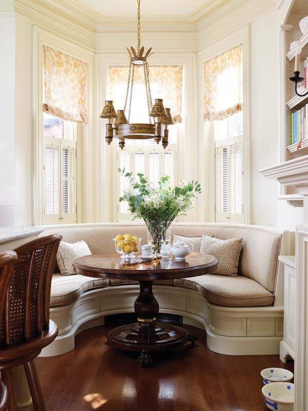 Should guests be enticed to pitch in with the dishes, however, it’s no chore in a kitchen as well-planned as this. Gleysteen—who designed all the new woodworking throughout—equipped the space with a generous island and a bounty of clutter-controlling cabinets. The cabinets’ soothing color—“off white and very pale, but more brown than cream,” stipulates Becker—reinforces the kitchen’s timeless look. The owners take breakfast seated on a luxe banquette. So smoothly does Gleysteen’s curved seat unfold beneath the windows, it’s easy to see why it could be pegged as an original feature. “The subtleties of scale, based on the human body, and proportion are a passion of mine,” the skillful architect says. “Learn them and you can make any room comfortable. People often sense one room feels better than another, but they can’t pinpoint why.”