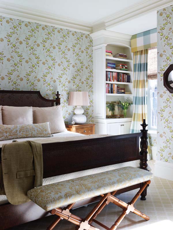 The third floor—site of the master suite and the husband’s study—is decidedly tranquil. In the bedroom a flowered wallcovering teams up with checkered silk curtains. Neither too feminine nor too masculine, the flowers and checks co-exist happily. Bonuses include a chaise for lounging with a book (and perhaps tea or a cocktail) and a fireplace (one of seven in the house). Becker custom-designed the bench at the bed’s foot for a perfect fit.