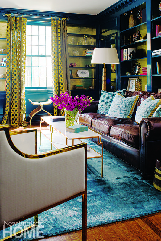 In another house, a masculine room with bookshelves painted deep teal, leather furniture, and gold drapes might properly be called a study or library, but in this case, a hidden wet bar in the corner explains the Kalins’ preferred moniker: the “cocktail room.” Clement employed gold accents, in the drapes and in the paint at the back of the bookshelves, to soften the transition to the adjoining living room.