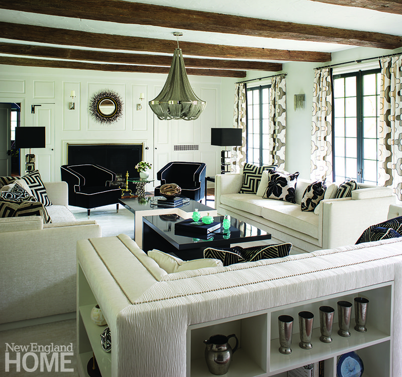 With its inlaid paneling and unfinished open ceiling beams and furnishings, the formal living room effortlessly blends nineteenth- and twentieth-century styles. The black-and-white color scheme and lacquered accents suggest Art Deco, but Clement says his inspiration came from Parisian apartments of the 1970s. “I’ve never believed that the architectural style of a home has to dictate the interior design,” he says. “The design should represent who you are, not what you are.”
