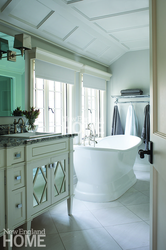 A sleeping porch off the master bedroom was enclosed and repurposed as a sitting room with the addition of a hipped roof with a beamed tray ceiling, which continues into the master bathroom, where a soaking tub provides a relaxed perspective on the manicured yard and gardens through a pair of oversize windows.