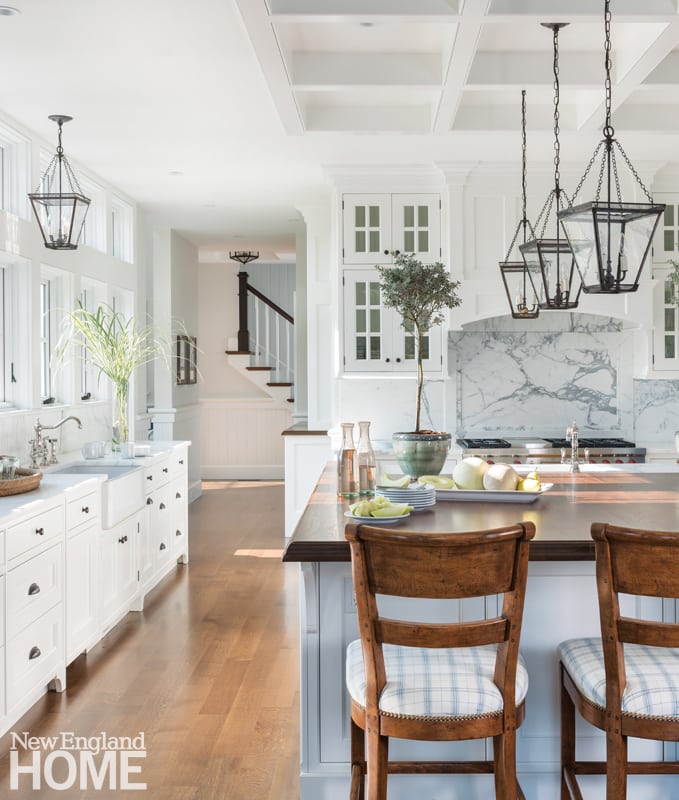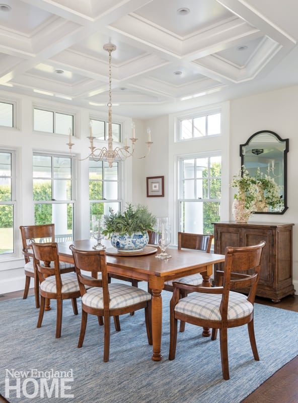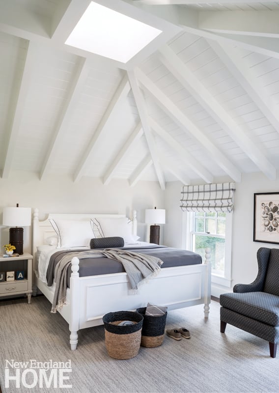 DaSilva balks at the idea that the home is a blank white canvas, noting that interior angles and the constantly shifting natural light conspire to play an array of grays across the rooms. For interior designer Susanne Lichten Csongor, the neutral palette and the home’s proximity to the sea called for restrained color choices. She used hues of linen, pale blues, and charcoal in the furnishings (largely English country antiques and reproductions), rugs, and window treatments throughout, often repeating colors but adding subtle variations in patterns from one room to the next in what she calls a “linked hierarchy” that makes each space feel distinct. V-groove paneling, nautical prints and oil paintings, and whale and boat accessories serve as reminders of the seaside locale.