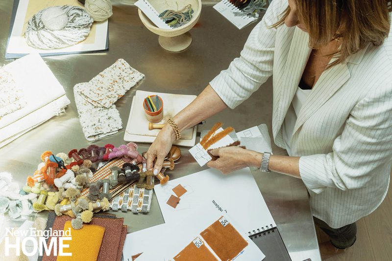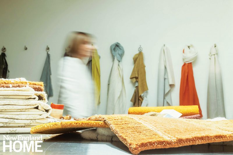 Rosemary Hallgarten readily admits, “I spend most of my time barefoot in my office.” And who can blame her? An alpaca-and-wool rug in Hallgarten’s confetti colorway begs to be walked on. It’s virtually impossible to keep your hands to yourself in her to-the-trade Norwalk showroom. Shelves stacked with nubby bouclé throws entice. A swing chair covered in shearling and an alpaca-upholstered sofa tempt you to snuggle. You just want to wrap yourself in the prevailing textural opulence.