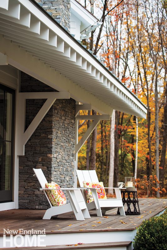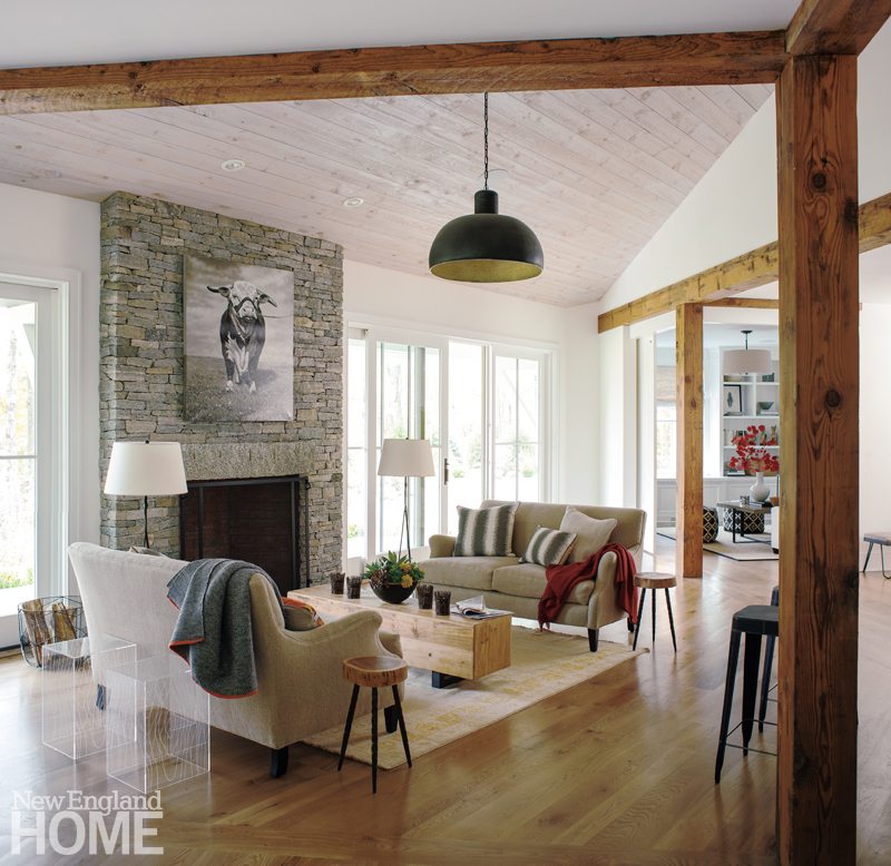 Using scale and modern materials, Harris, who worked with Danbury-based builder Jim Blansfield, married traditional farmhouse details with the home’s contemporary vibe. “It was important to understand the traditions, but we wanted to articulate them in a more up-to-date way,” Harris explains. Case in point: the six four-pane windows, all seven feet tall, whose grouping makes one corner of the sitting room disappear. “These emulate a mid-nineteenth-century window, except they’re so blown out of proportion,” Harris says. “We’re pulling in on a regional, recognizable window, but making it large enough that it becomes a picture window. By ganging them together, it becomes more about the view than the actual window.”
