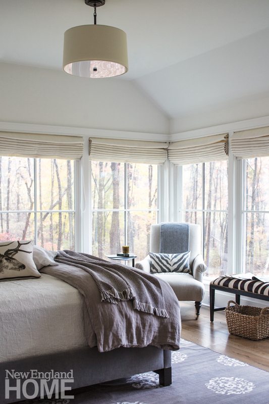 Another vestige of tradition is found upstairs, where the thirteen-foot ceiling in the master bedroom angles down to meet the wall, suggesting a room tucked under the eaves. “It recreates that feeling in an old house where the roofline is visible, like you would find in an older saltbox or colonial,” Harris explains.