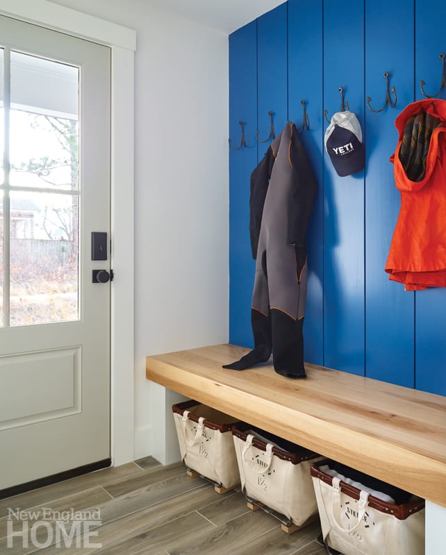 Crestin first turned her creative focus to the stairs and millwork throughout. In addition to the bold balustrade, she added board-and-batten to staircase walls. Riffing off the seaside motif, the designer also used shiplap for kitchen cabinets, kitchen and living area ceilings, and mudroom walls.