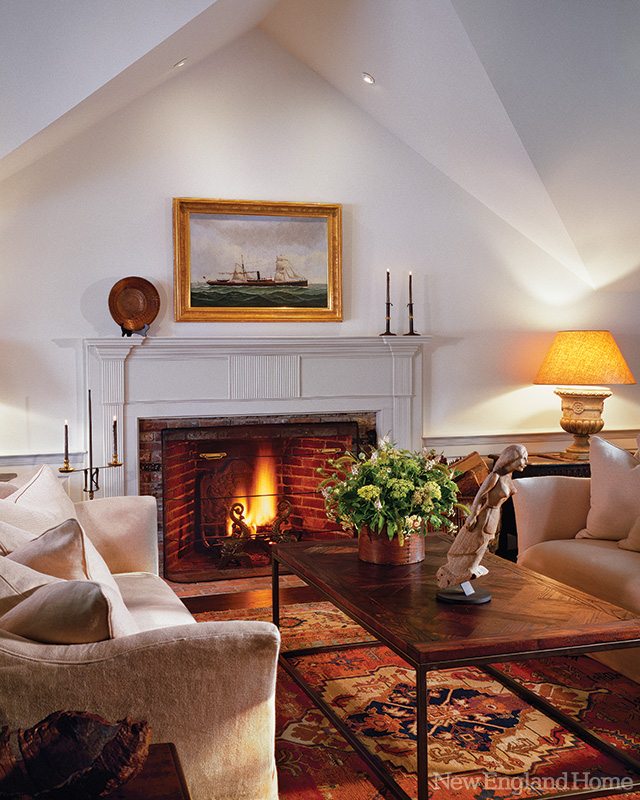 Telfer’s skillful work has given the old house a modern flow. Yesterday’s galley kitchen is now a TV room, and there’s a comfortable new dining room and kitchen. Take-a-photo views pop up at harbor-facing windows all along the rear side. And every space from the drawing room to the “snug” (Halpern’s label, yanked from her British roots, for a small room—in this case, a small paneled sitting room) shares the same neutral palette and stylish, easy-on-the-eyes decor. Incorporating a cherry-picked bounty of antique treasures, including a number of marine paintings, Halpern has concocted a genteel, but easy ambience.
