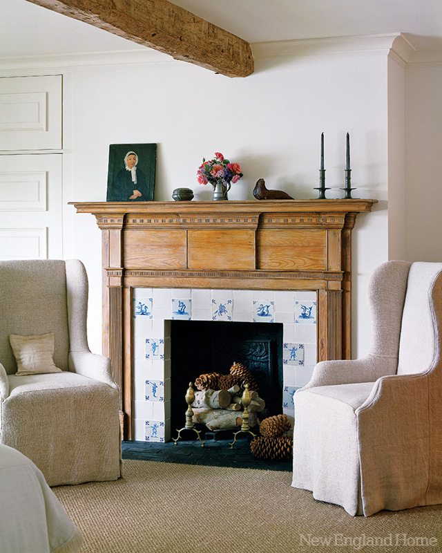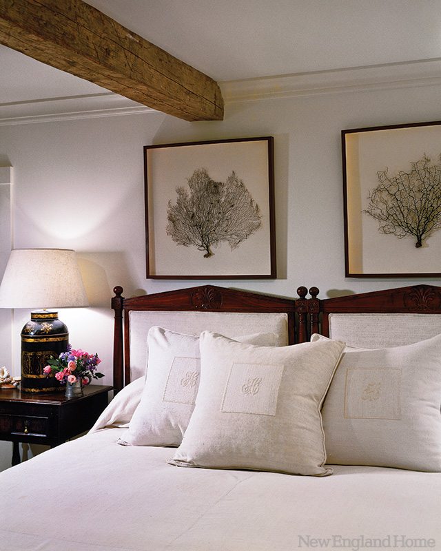 Chic, timeless furnishings also suit the bedrooms—one on the top floor, two on the ground level (the main floor in between holds the public areas). In the couple’s private quarters, where exposed beams, an eighteenth-century fireplace surround and Delft tiles vie for attention, an antique tea caddy-turned-lamp roosts beside the bed. Halpern created the bed’s headboard by marrying antique twin headboards she discovered at a local auction. Soft antique French linens, part of her growing collection, are a dream-inducing indulgence.