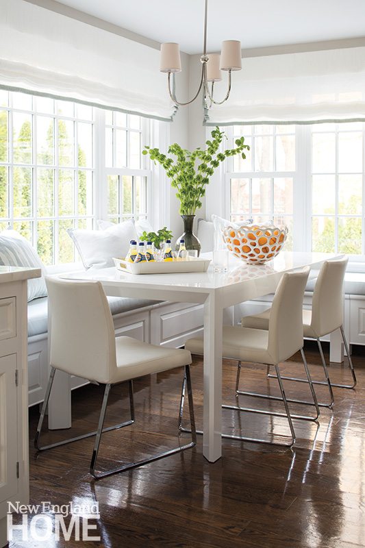 Morgan Harrison added the built-in banquette and a vinyl-covered cushion in a blue so pale it looks like snow in twilight. It surrounds a lacquered white table and white vinyl-covered chairs.