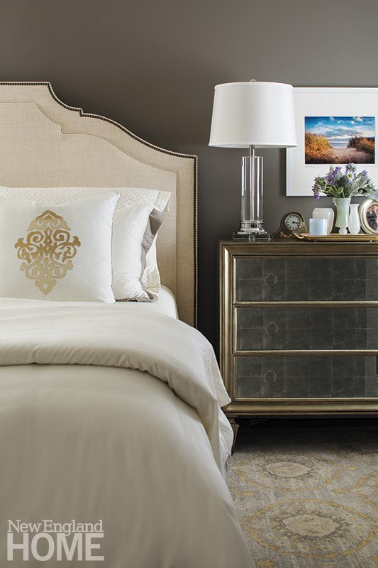 Upstairs, the master bedroom is a sea of tranquility in what can sometimes be a slightly chaotic household. Chocolate brown walls recall the mocha tones from the living room, and creamy-colored bed linens and pillows echo the ivory tones from the family room. The upholstered headboard’s edge is defined with a tight nailhead trim, and to either side, a mirrored dresser serves as a nightstand.