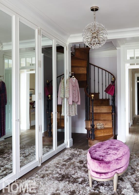 The master suite includes a sitting room, his and hers baths and dressing rooms, and a private porch. The wife has a gorgeous sanctuary in the turret, with an antique desk and modern chaise set up to take advantage of the stunning views. The husband’s retreat comprises most of the top floor. They both have spiral staircases inside their dressing rooms; hers leads to an extension of her closet, and his takes him up to his getaway.