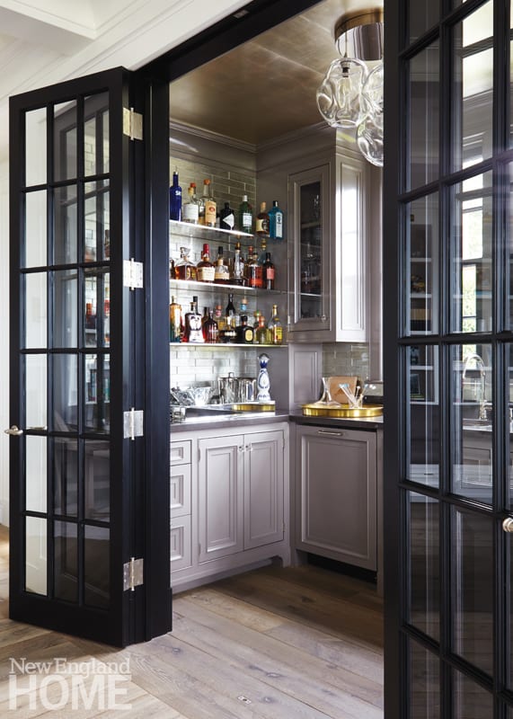 There’s no formal dining room, by design. “They wanted the porch to work really well, so it serves as the dining room,” says Wells. An expansive, flat backyard is perfect for a large tent that can hold several hundred guests. Indoors, a flexible sitting area with four comfy barrel chairs is easily transformed into a dining space. Other indoor entertaining spaces abound—from a living room with a walk-in bar to a family room that connects with a wide-open kitchen to a no-holds-barred lower level that houses a bowling alley and media room. A shout-out to that living room bar: while it was always intended to be a separate space, it was Wells who suggested the black doors, taupe cabinetry, and silver leaf backsplash that add easy elegance.