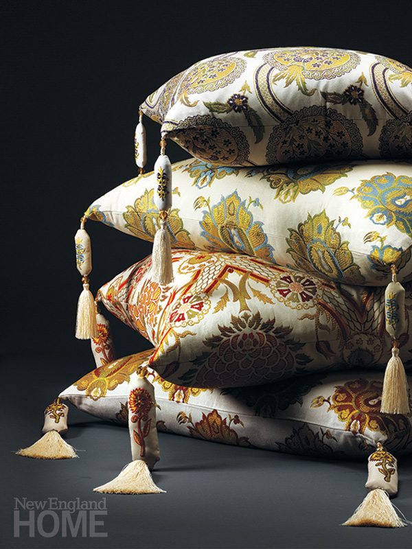 Working from a modest 1920s Arts and Crafts farmhouse in Tunbridge, Vermont, Dollenmaier started Anichini (named after her former business partner) in 1986 as a textile wholesaler, importing fabrics from abroad and using locally based Vermont stitchers to cut fabric and sew, creating custom pillows, duvets, and more. “There were many skilled stitchers right around here who had worked in the Vermont textile industry before it left for Mexico, China, and elsewhere,” she explains. “I was thrilled, and immensely lucky, to find such talented, experienced women in this small Vermont valley.” The local craftswomen work out of a nineteenth-century farmhouse just down the road from the yellow farmhouse that serves as Anichini’s corporate headquarters.