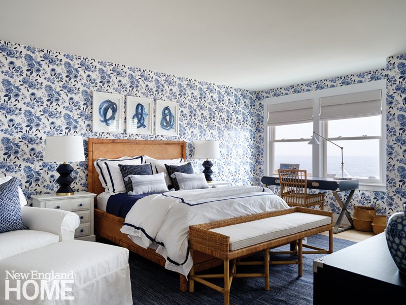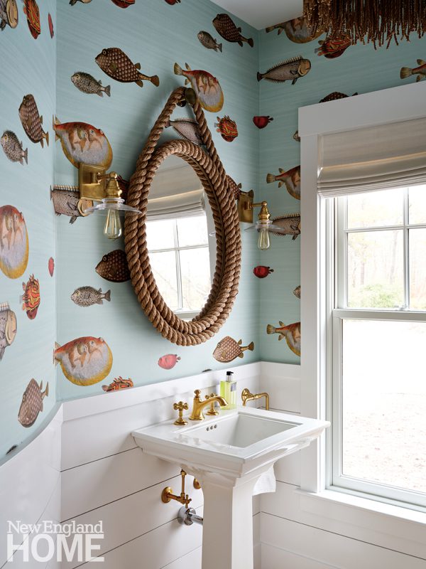 And the most fun room in the home might be a powder room featuring a whimsical fish-pattern wallpaper from Cole & Son. Complete with a rope mirror, vintage-style brass sconces, and shiplap paneling, the petite space is an elegant nod to its stunning seaside location.
