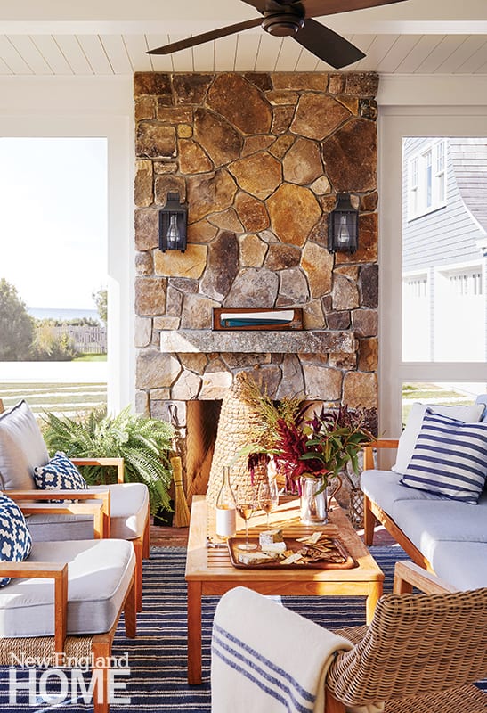 Architect Vincent Falotico could hardly have designed a more suitable house for fulfilling that hope. The Shingle-style home is a New England beachfront classic with its gabled dormers, stone chimneys, and a series of porches that cascade from top to bottom of the two-and-a-half-story structure. “This is a low-key community,” Falotico notes. “They didn’t want the house to pop out.” That said, the homeowners did choose to paint the exterior an eye-catching shade of summer-sky blue.