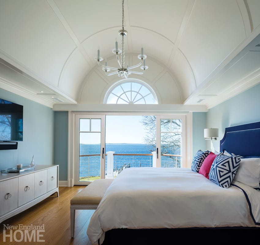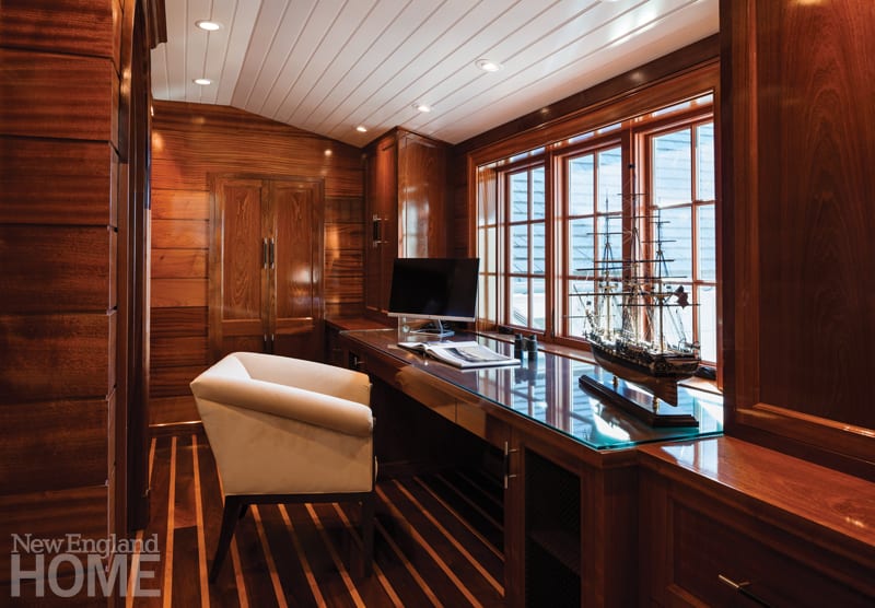 The husband’s office ups the nautical ante with a teak and holly floor, treated with a special yacht finish, and horizontal paneling in mahogany. From his window, he says, “I can keep an eye on the boats and pretend I’m outside.”