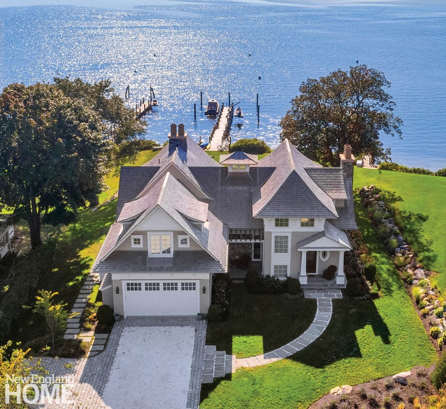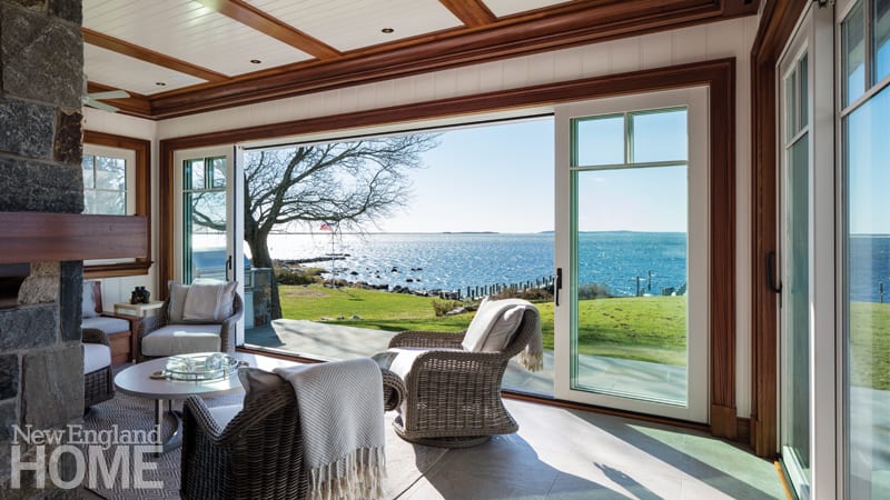 He calls the architecture “Newport shingle-style,” which speaks to its enhanced exterior detailing and historic roots. The exaggerated roofline, with its flared sweep, lends character, as does the commanding stone chimney, and the brackets on the overhang are an elegant architectural detail. The overall feel is reminiscent of materials found on a stately ship, notes Cadoux, especially the stainless-steel rods of the railings, and the soffits, which are fabricated from natural cedar and treated with five coats of marine-grade varnish. “It looks like the hull of an old Chris-Craft,” he says.