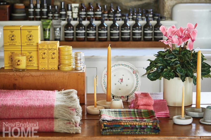 On a recent Saturday afternoon, we took a tour of the shop, courtesy of Andrew Fry, who runs the business with his partner, Michael DePerno. Fry seems to never tire of showing folks around, describing the provenance of this vintage bowl or that cashmere Himalayan blanket. He smiles when asked about the building, the circa 1897 Pavilion Hall. “It was owned by the town and was used for meetings, concerts, and events,” he says. The old structure had fallen into disrepair and was vacant for a long time when the two men took a shine to it. In a perfect example of adaptive reuse, they transformed the space, the project garnering an award from the Connecticut Trust for Historic Preservation.
