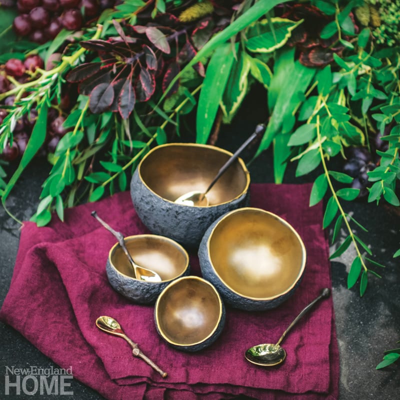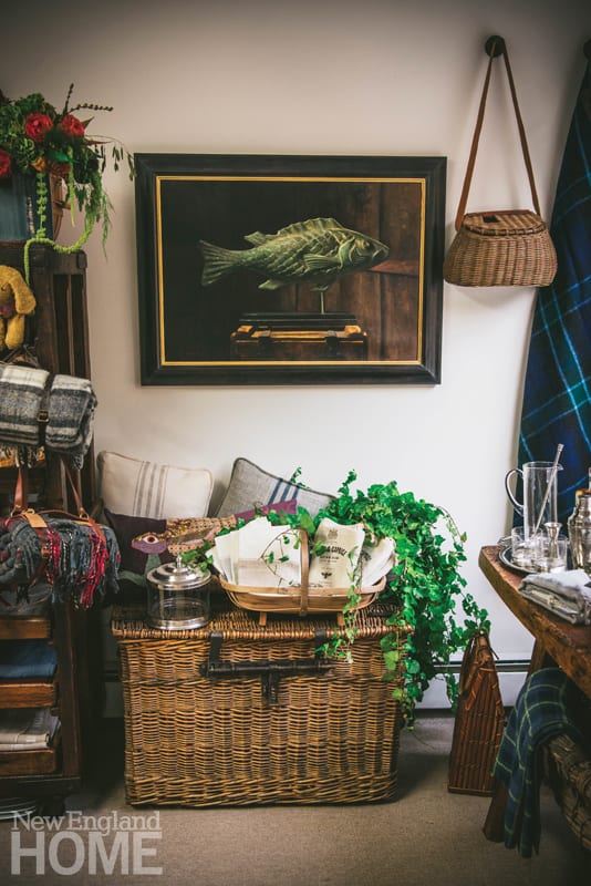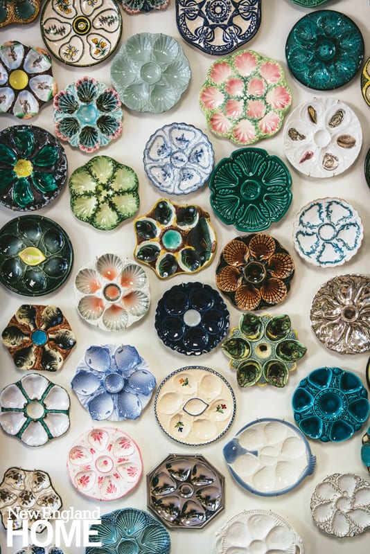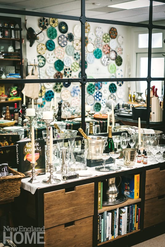 Last April, O’Connor and Arnold opened a physical space in Weston’s tiny downtown. Entering the shop, you’re greeted by a wall of vintage Old World oyster plates. (There’s one plate on the wall from the U.S.; make sure you ask about the story behind it.) Wool blankets from Swan’s Island, Maine, and sushi plates handcrafted in Arizona coexist with Match pewter, proprietary maple syrup, Simon Pearce barware, antique French cutting boards, designer fire extinguishers, and a repurposed, vintage Louis Vuitton trunk. At the back of the boutique, a wall of screens flashes images from the Weston Table website.
