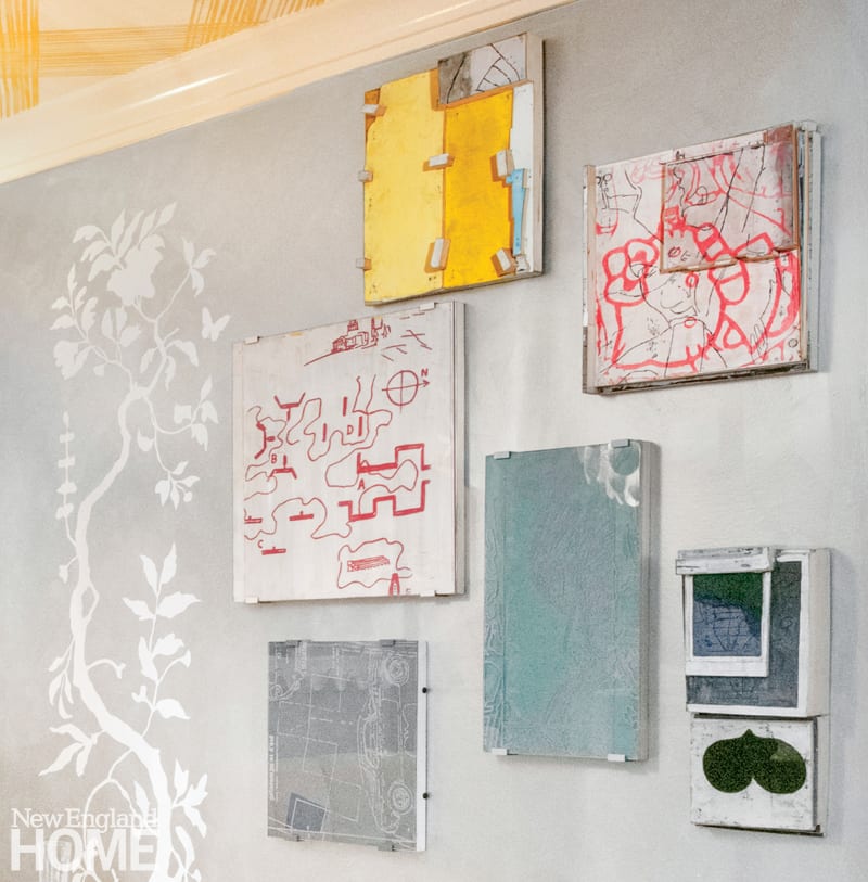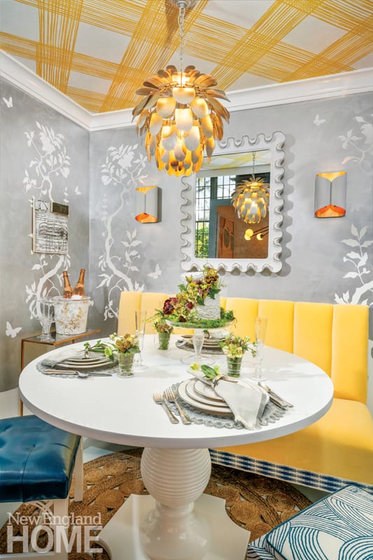 Is breakfast time too early for a party? Not when the champagne is perfectly chilled, and the setting is as festive as the one created by Greenwich designer Amy Zolin. Silvery walls hand painted by Ridgefield decorative artist Christopher Rollinson nod to the event’s twenty-fifth anniversary. To that elegant backdrop, Zolin added playful color. “Blue and yellow together make a really happy space,” she says. Indeed, the ceiling’s Schumacher fabric makes the whole vignette feel washed in sunshine. Gold and silver light fixtures, a lacquered Dunes and Duchess table, and accents of luscious blue leather provide still more shine. Cynthia Byrnes Contemporary Art rounded out the look with a collection of modern works by New York artist Eugene Brodsky.