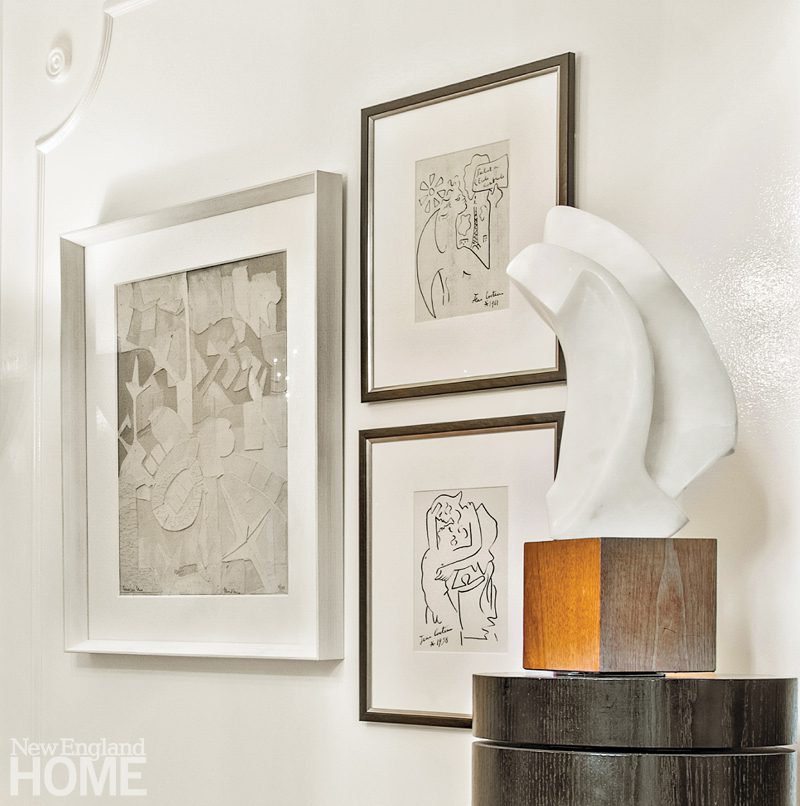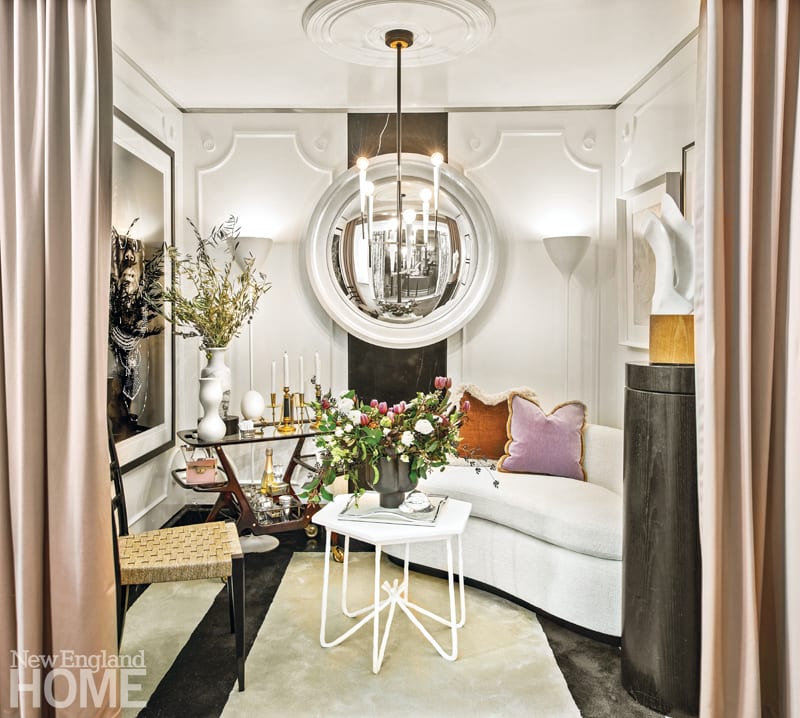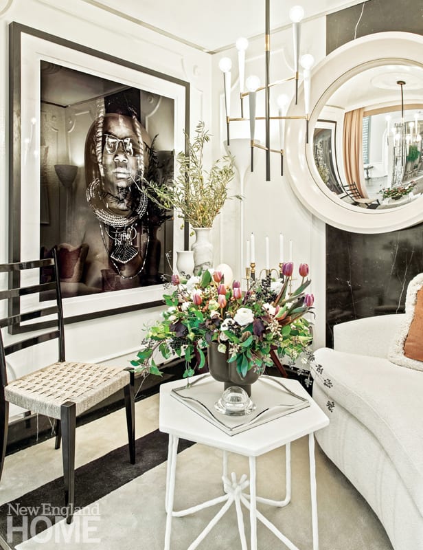 In Christina Roughan’s elegant salon, the details matter. The wall moldings, reminiscent of Parisian architecture, are lovely all by themselves, but just look at how Roughan has played them up with polished nickel trim along the top and a striking panel of black marble that cascades between the two panels at the back of the room. The sleek sofa, a Roughan design influenced by 1940s Paris, is made all the more enticing by a pair of fringed pillows. Throughout the space, Roughan combined traditional and modern elements. Witness the 1950s-era Italian chandelier that hangs from the classic ceiling medallion. Even the art gets in on the time-travel act; ink drawings by Jean Cocteau hang across from Gangsta, an arresting photograph of a Namibian girl by British photographer David Yarrow.