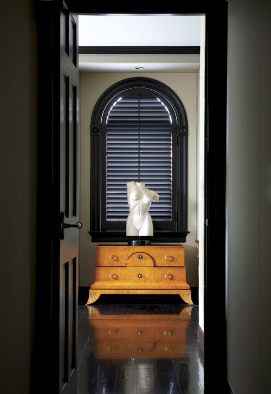 Down the hall from the kitchen sits a marble statue against a shuttered window, perfectly framed by the master bedroom’s doorway. The bedroom is a quiet sanctuary with its upholstered walls and headboard, which temper the light that floods the public spaces and soften any building sounds.