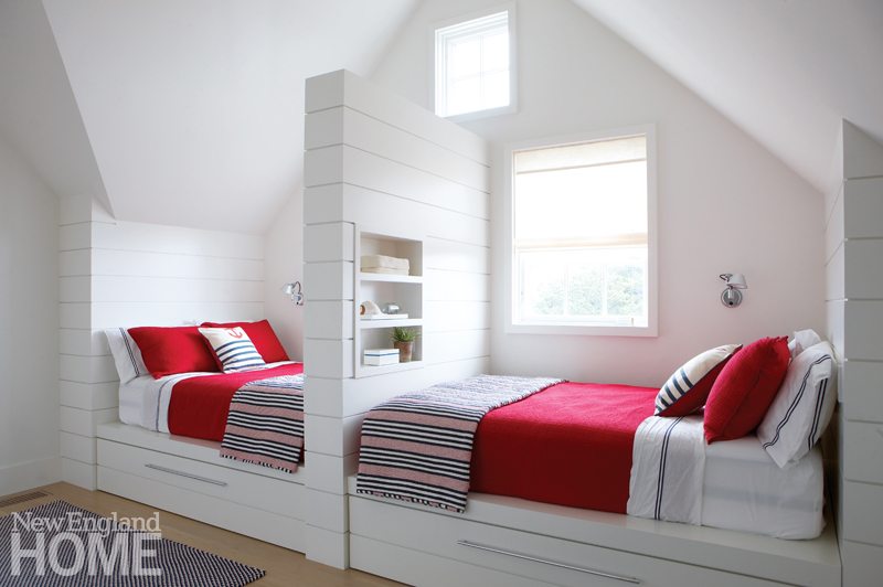 The boys’ rooms have been given a touch more masculinity, still with plenty of blue. A navy coverlet strikes a nautical note in the oldest son’s lair, where the bed is framed with shiplapped white oak. A gray stain between the boards—just as on the shiplapped hearth—lends depth. The two younger boys’ beds rest foot to foot with a privacy wall in between. As Gamberoni sees it, this carefully crafted wall that doesn’t meet the ceiling is a fun feature. “I had a lot of brothers and I’m also a father. I like to imagine the boys climbing over it,” he says with delight. “The whole time we were working here, we were conscious that the owners were really intent on sharing this place. It made it a special project.”
