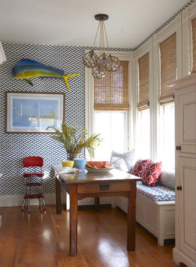 Tall and narrow windows bathe the casual breakfast area in natural light.
