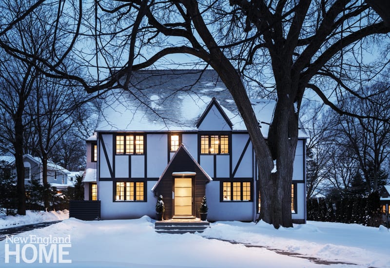 That front door once opened directly into the living room, so the architects added a new vestibule, crowned with an asymmetrical gable (in homage to the home’s Tudor roots) and sheathed in slatted siding that hints at the design vocabulary in the rear addition. The frosted-glass door glows like a lantern at night under the outstretched boughs of a behemoth American elm—a rare survivor of the Dutch elm disease that ravaged North America during the last century.