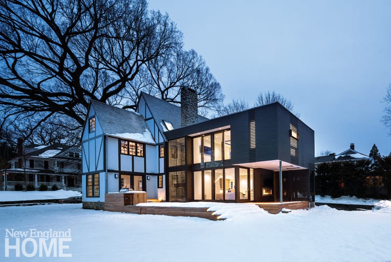 The architect’s addition to a 1920s Tudor-style house in Rye, New York, stands in stark contrast to the original’s Merry Olde England mien. Sleek and boxy, with a flat roof and floor-to-ceiling windows, the addition asserts itself with a bravado that’s both attention-grabbing and shrewdly understated. Tucked behind the Tudor and hidden from the street, the new wing’s squat proportions and charcoal siding pay homage to the old house without upstaging it.