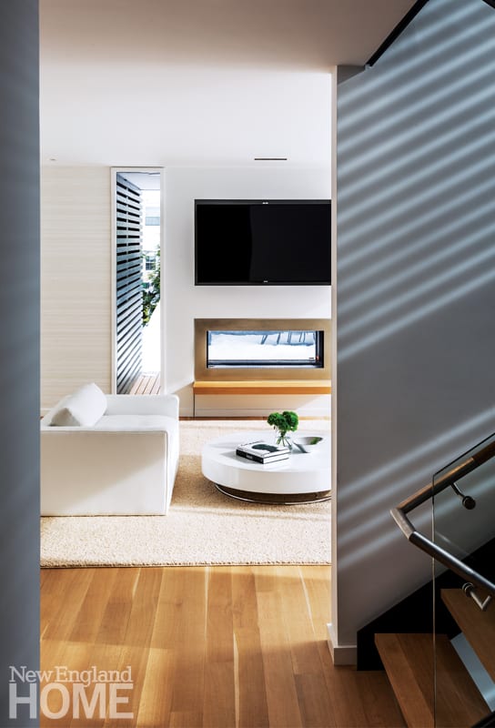 The Tudor’s old chimney was incorporated into the new stairwell, which is illuminated by a two-story window. The architects extended the home’s wood siding across the window, eliminating every other board to produce a series of slats that preserve the view out but obscure the view in. “If that was all glass, everybody moving up and down the stairs would feel very exposed,” explains Moore, who repeated the effect over the windows in the master bath (where shades provide extra privacy).