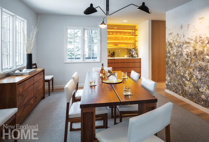 The same playful spirit is evident in the dining room, where a lemon-colored backsplash lends swagger to the bar, and a vacant wall is covered in a dappled abstract wallpaper. The spidery lines of a Serge Mouille lighting fixture protrude from the ceiling, adding a midcentury vibe to the mix.