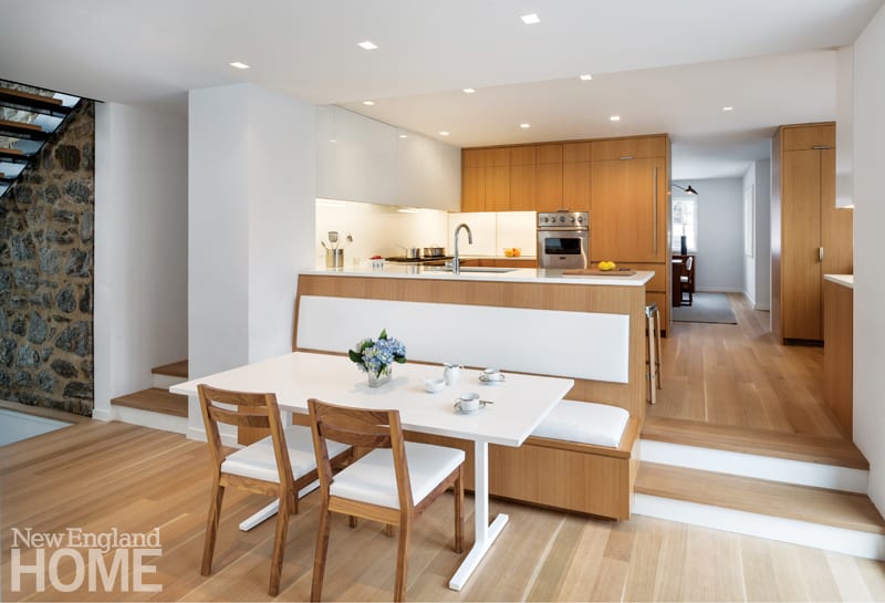 While the old house felt closed off from its surroundings, the addition feels almost evanescent, with glass doors at every turn linking the family room to the deck and backyard beyond. (Even the fireplace is transparent, so the Perriellos can enjoy it while sitting on the back deck.) Sunlight enters from every direction, bouncing off the kitchen’s white-glass backsplash, matching cabinet fronts, and crystallized-glass counters. White oak base cabinets add a warming note and support the back of a banquette that juts into the corridor, anchoring a family breakfast area.