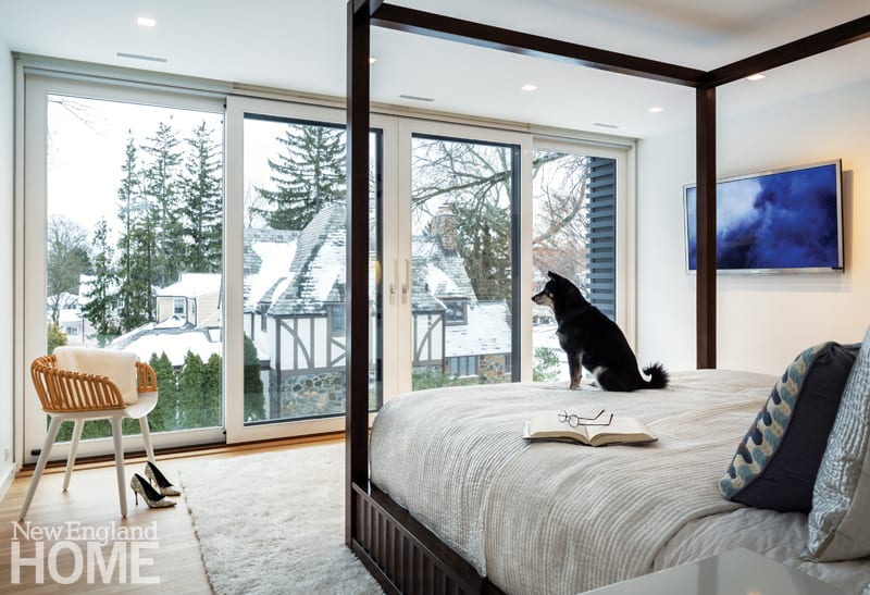 To help blend old and new, the architects cleaned up the interiors of the Tudor, updating the trim and installing recessed lighting and the same white oak floors that appear in the addition. Walls throughout were painted a single shade of white, and the rooms were decorated in a consistent manner, with neutral modern pieces scaled to fit the smaller rooms in the old part of the house and the larger spaces in the addition.