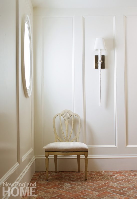 Function and flow were the first order of business, Gauthier says. The everyday entry from the side porch was critical. To ease the transition from outdoors to indoors, Gauthier designed an informal foyer grounded with a reclaimed brick floor. It opens to a highly practical mudroom with a walk-in closet and a powder room. “It’s not abrupt,” says the wife of the new foyer. “It’s a different way to enter the space and it works beautifully.”