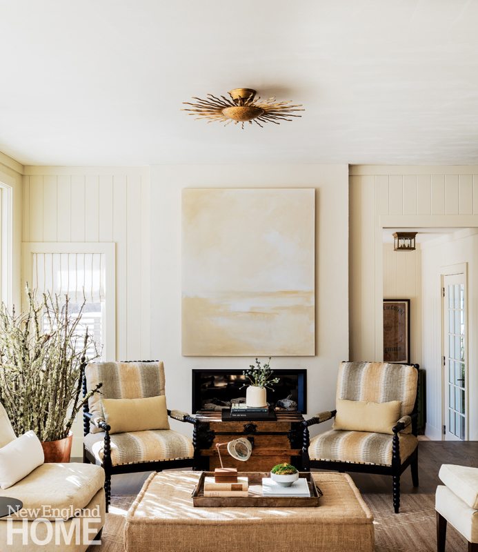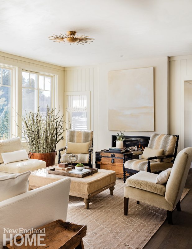 Inside, interior designer Lisa Tharp turned to “honest and natural materials” like concrete countertops, plaster or stone walls, grasscloth wallpaper, and unfinished wood beams. “We took a brand-new house and gave it a sense of age and patina, she explains.