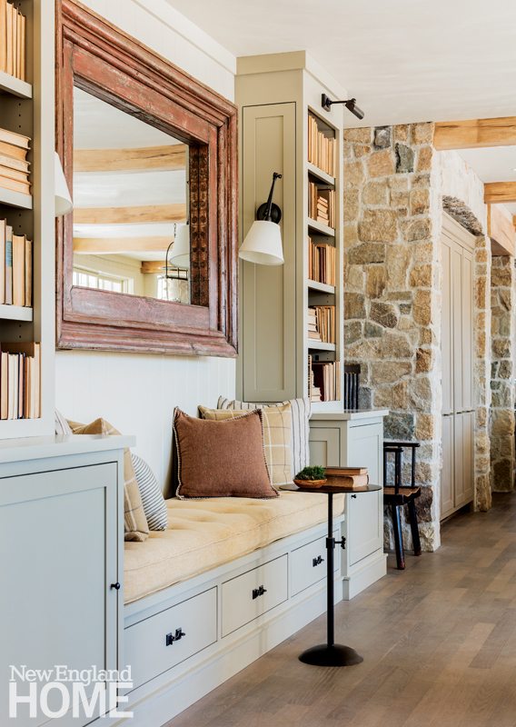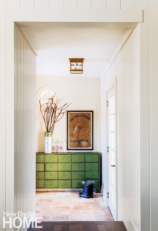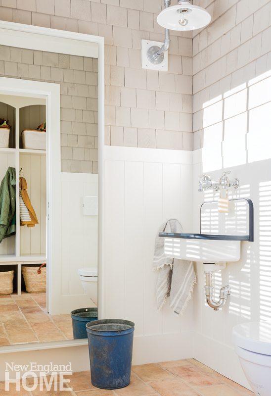 Throughout, Tharp chose design elements that blur the lines between indoors and out. In the addition, a round window lets the mudroom and bathroom share light. The bathroom’s interior walls are clad in outdoor shingles, while a wall-mounted goose-neck lamp and an enamel sink evoke a cheery beach bathhouse. The floor tiles are actually antique Parefeuille roof tiles.
