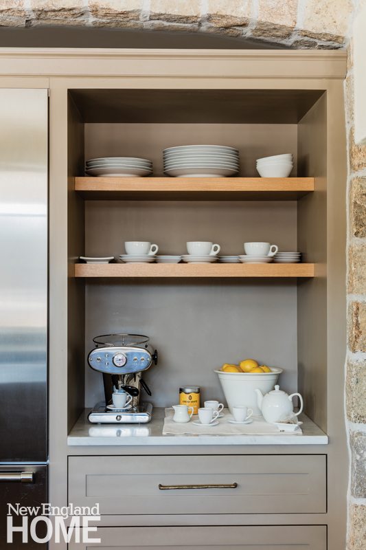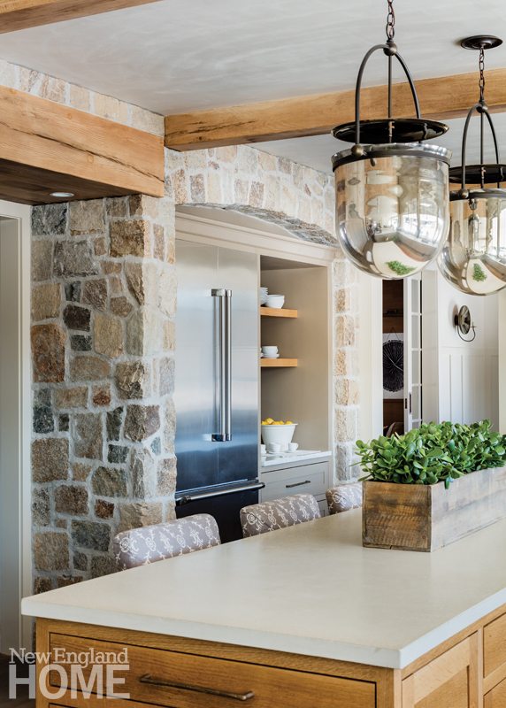 An added doorway arch and walls in the kitchen are veneered in stone that matches the cladding on the outside of the pool, with a texture that’s “chunky, like an old stone wall,” says Tharp. Furniture-style built-ins replace the storage lost when the upper cabinets came down and blend harmoniously with the family-room decor in the open floor plan.