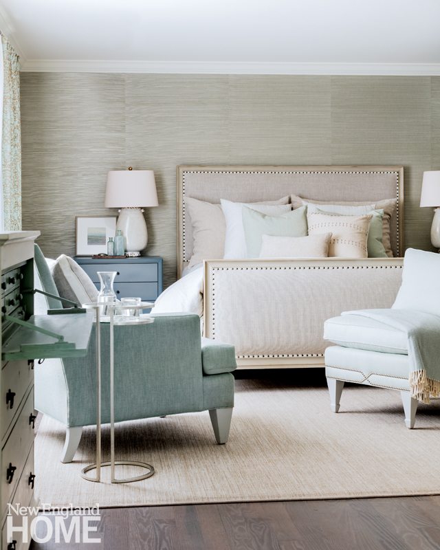 Across the hall, by contrast, the master bedroom is bathed in light, reflected in the textured tans of the wallpaper, carpet, and bedding and in the soft blue palette carried through the track-arm lounge chair, slipper chair, and nightstand. Like the kitchen, dining room, and family room downstairs, the master bedroom is built around long views to the meadows. “I love the elevation looking out and waking up to the sun,” the owner says.