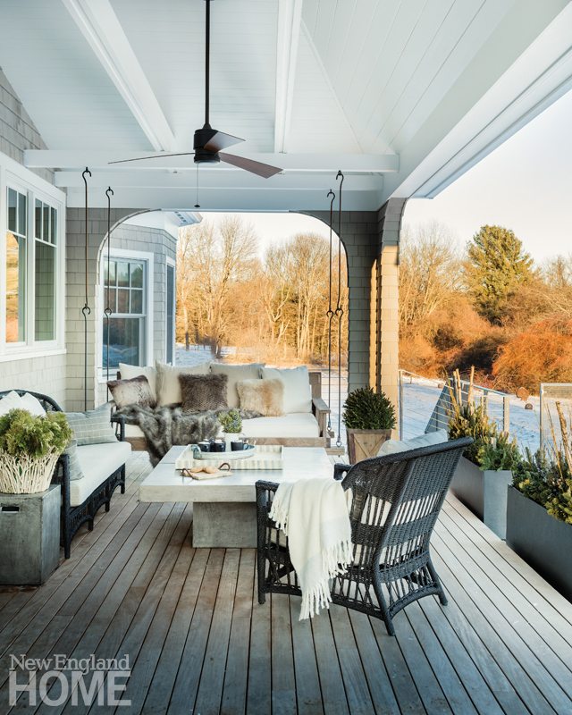 The first step in the transformation was the addition of a covered, Shingle-style porch and pool deck to the rear, an occasional outdoor yoga space that begins at the level of the kitchen and family room and steps down to a new swimming pool. Unobtrusive landscaping by Michelle Crowley Landscape Architecture ensures that the additions, built by Merz Construction, gently fall away from the house with the natural slope of the land, leaving the views from indoors unobstructed. The porch, designed as a three-season-plus living space, features a daybed swing (“the best seat in the house,” the owner says), with sofa and chairs arranged around a concrete coffee table. A pair of planters creates a gentle separation from the deck area below. “It’s unusual in New England to have such an extensive outdoor living space that’s not screened in and is open to the elements,” says builder Jonathan Merz. “It’s more of a California home.”