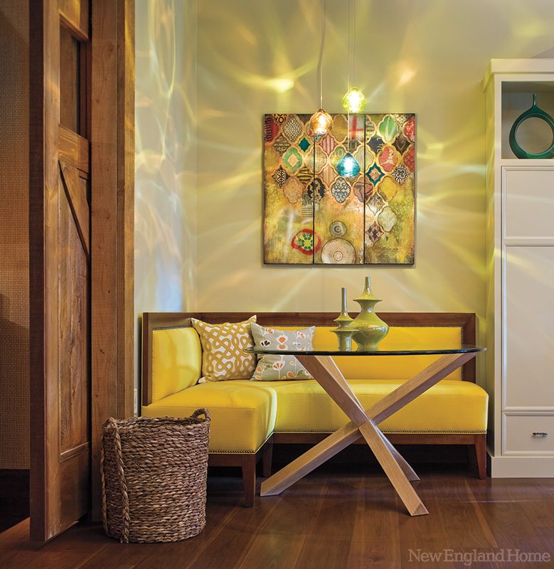 Except in the downstairs playroom, colors are subtle—an array of neutrals complemented with yellows ranging from muted gold to sunny lemon. “The owners use the house in all four seasons, so the colors have to feel warm in winter and look good with foliage in summer and fall,” Palumbo says. “In the kitchen, we were dealing with heavy beams, so we incorporated texture and kept to quiet paint colors.”