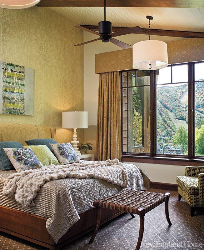 The first-floor master bedroom follows a similar motif. Grass cloth wallcovering that mimics birch bark provides texture and a sophisticated, subtle metallic lemon-green color. The beamed, slanted ceiling lends a cozy touch.