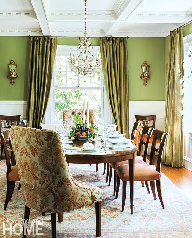 The consistent palette pulls the large house together, creating a harmonious vibe from top to bottom. When his clients requested that one room be green, Langlois smoothly integrated the color by designing an elegantly traditional dining room that includes chairs with cinnabar-hued seats. Clad in white, the original paneling and coffered ceiling underscore the springlike green, making it pop. The silk drapes mimic the wall color for consistency, but a closer look reveals lean cinnabar stripes—a master stroke that adds to the consistency and offers evidence of Langlois’s penchant for details.