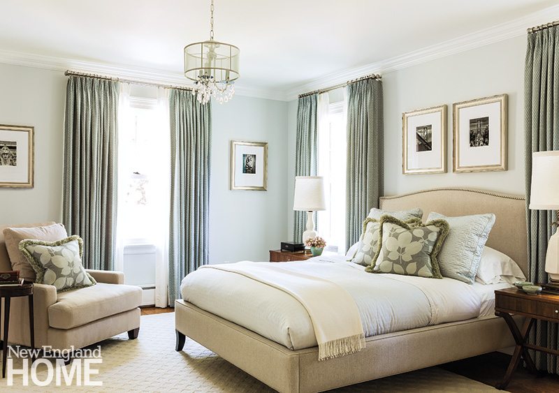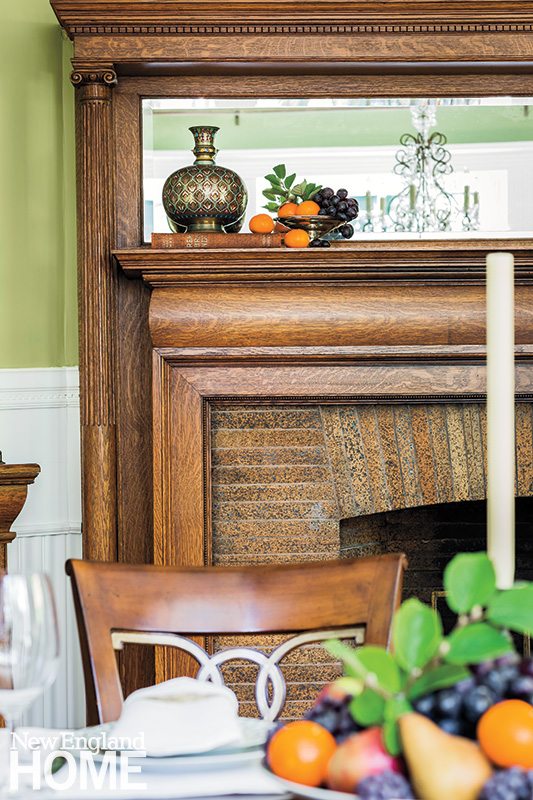Mismatched vintage Oriental rugs that share similar colors delineate the sitting room’s conversation areas—one slightly more formal than the other. In the former, twin Bombay chests are backed with stunning antique Oriental screens snagged at the Brimfield Antique Show. Luscious drapes of wool and silk frame the windows. “There are so many windows. I felt the house demanded drapery,” Langlois says. On the sitting room’s opposite side, the tone grows more relaxed. Cozy banquettes flanking the fireplace conjure thoughts of children curling up with storybooks on rainy days.